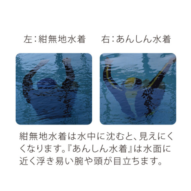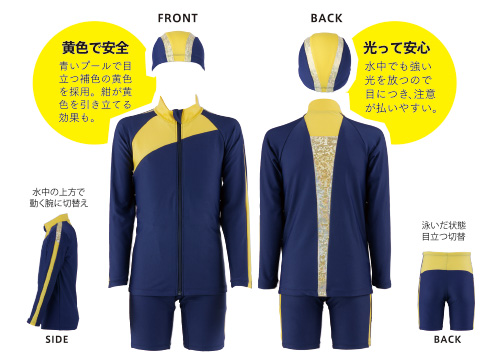 「あんしんスクール水着」は、水中でも目立つデザインと光に反射するホログラムを採用し、指導者が児童の存在を分かりやすく認識し、より安心安全に水泳授業が行えるようサポートする水着です。