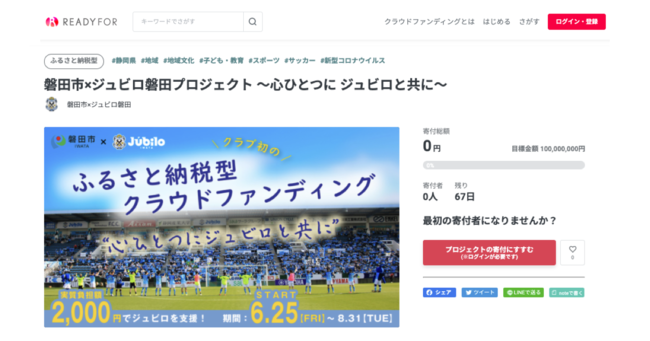 ジュビロ磐田は、昨年実施したクラウドファンディングにて約2,500人から目標金額の2.5倍となる5,000万円ものご支援をいただきました。コロナ禍による集客減やチーム運営費の増加により今年も大幅な赤字が見込まれるなか、本年は磐田市と共にふるさと納税型クラウドファンディングを実施いたします。本プロジェクトでは返礼品の企画に選手が参画し、ご寄付いただいた方々には2021Limitedユニフォームのほか、磐田茶やメロンなどの磐田市の特産物も予定しております。皆様と共に現在の困難を乗り越え、磐田市民、そしてジュビロに関わる全ての皆様に「夢と感動」を与え続けられるよう、真摯に取り組んでまいります。