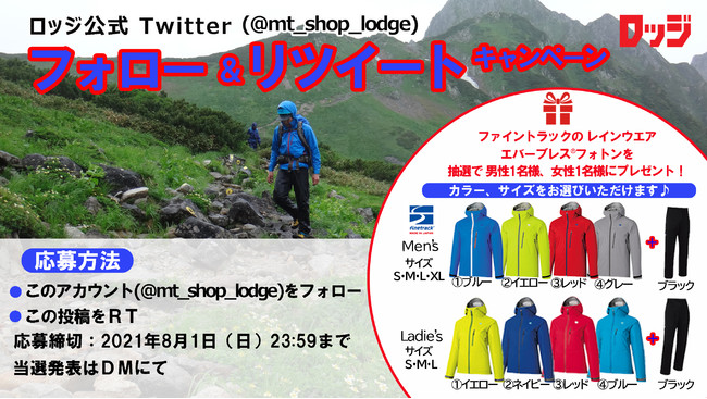 ゼット株式会社(本社/⼤阪市天王寺区、代表取締役社⻑/渡辺裕之)のグループ企業「⼭とアウトドア専⾨店ロッジ」は、ロッジ⼤阪店公式Twitterアカウント(https://twitter.com/mt_shop_lodge)にて、ファイントラックのレインウエアが抽選で当たるTwitterフォロー&リツイートキャンペーンを開催中です。