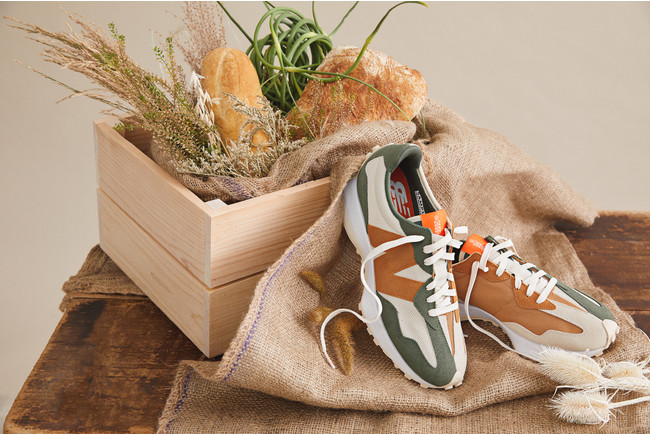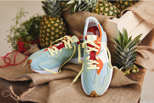 ニューバランスとトッドスナイダーによるコラボレーションコレクションはニューヨークのグリーンマーケットからインスピレーションを受けて誕生した「THE FARMERS MARKET COLLECTION」。人気のMS327をベースに、小麦、パイナップル、ザクロをテーマにした3色がラインナップされています。農場の色鮮やかな色彩と都会の喧騒をイメージして色付けされ、それぞれのカラーのタンにはモチーフとなった穀物、果物がデザインされています。夏の爽やかさを表すメッシュと、ドレスシューズに使われるようなスエードを採用しています。シューズの中心から左右に色を反転させたスプリットカラーでデザインされ、小麦はオリーブとタン、パイナップルはブルーとオレンジ、ザクロはオレンジと赤の組み合わせです。