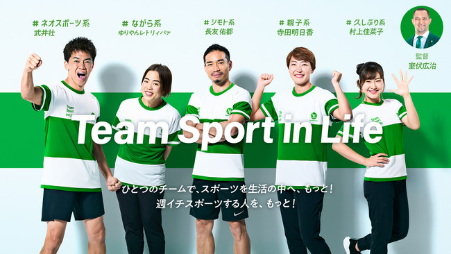 Team Sport in Lifeは『ひとつのチームで、スポーツをもっと生活の中へ!目指せ、週イチ、1000万人運動!』をコンセプトに結成。一人ひとりに自分に合ったスポーツを見つけてもらうために、さまざまなスポーツをわかりやすく五つの〇〇系スポーツに集約し、それぞれのスポーツを伝えるチームリーダーとして5名のアンバサダーが就任しました。