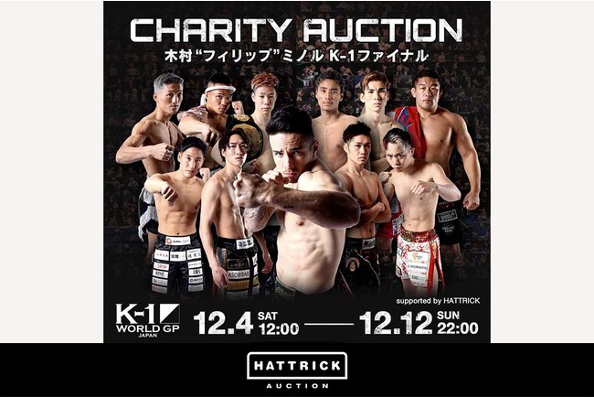 ・出品商品:12月4日に行われるK-1 大阪大会のスーパー・ウェルター級タイトルマッチ、フェザー級タイトルマッチで勝利した選手のアクリルプレートや、実際に選手たちが激闘を繰り広げたリングのコーナーポストや入場時着用Tシャツ、さらに木村フィリップミノル選手の等身大パネルやチャンピオンバナーなど(直筆サイン入り)