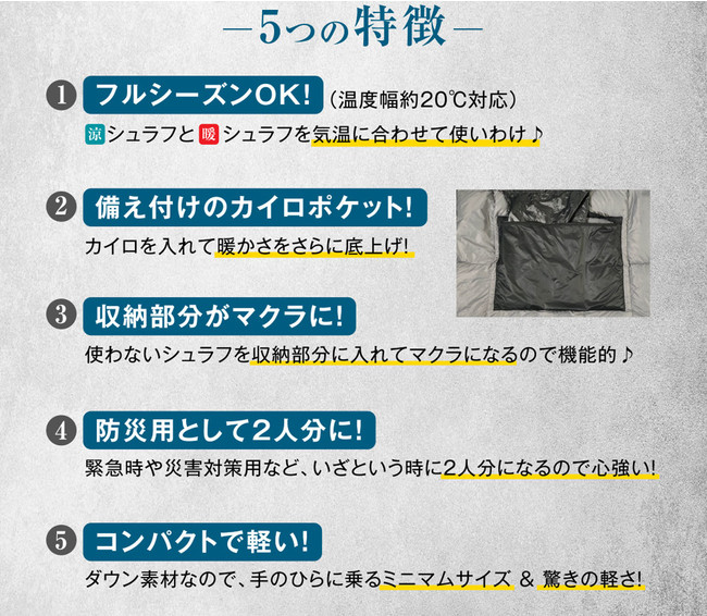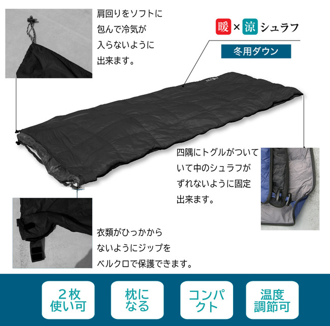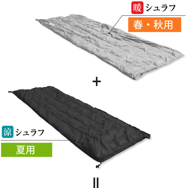 1.夏用「涼シュラフ」、春用「暖シュラフ」、2枚重ねて「冬用シュラフ」でフルシーズン対応