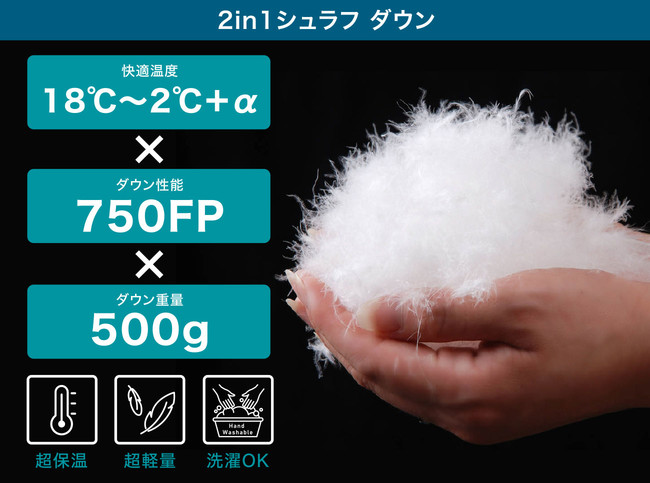 2.軽量化&ミニマム化のため14の工場から選り抜きのダウンFP750・500gを採用。コスパが高い