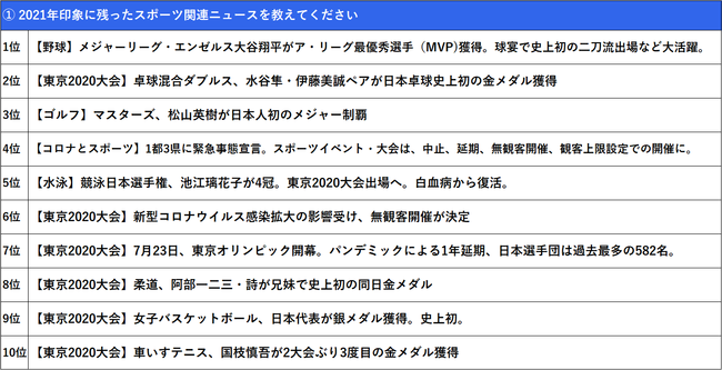 2021年12月10日から12月19日にかけて当財団ウェブサイトでアンケートを実施。2,376票の回答結果により、2021年において印象に残ったスポーツ界の重大ニュースと活躍したアスリートが明らかになりました。