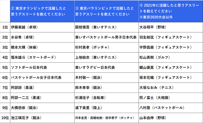 - 東京オリンピック、パラリンピック、東京2020大会以外で活躍したと思うアスリート
