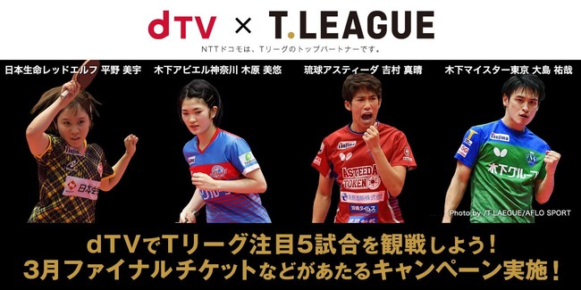 また、配信を記念して2022年1月20日(木)より「dTV×Tリーグ プレゼントキャンペーン」を開催。 2022年3月3日(木)、3月4日(金)に開催のプレーオフ ファイナルの観戦チケットや選手のサイングッズ、選手とのオンライントーク権などが抽選で当たり、Tリーグをより身近に感じながら応援できるキャンペーンとなっています。