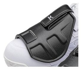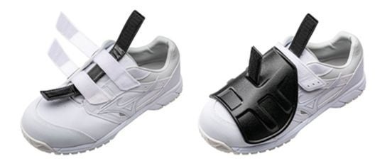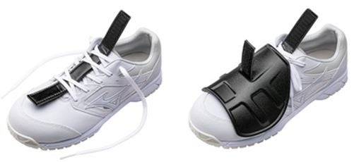 ミズノ「足甲プロテクター」は、シューズとの取り付け部分に面ファスナーを採用することで紐、ベルト両タイプのシューズに簡単に取り付けることができます。