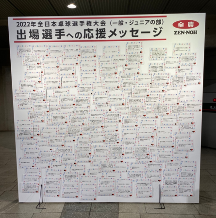 JA全農は選手エリアに全国の卓球ファンからの出場選手への応援メッセージを展示。1月18日(火)からSNSで募集を開始し、期間中に集まったメッセージは計779件(1月30日時点)。「最後まで諦めず一球一球魂をこめている選手が大好きです!これからも頑張ってください!」、「いつも応援しています。卓球を通してスポーツの面白さを伝えてくれてありがとう」といった応援メッセージが寄せられ、会場に来られないファンの方々からのエールを選手の皆さんにお届けしました。