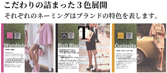 | カラー展開 | WANDERLUST(ピンク) RICH BLACK(ブラック) CURIOSITY(イエロー) |