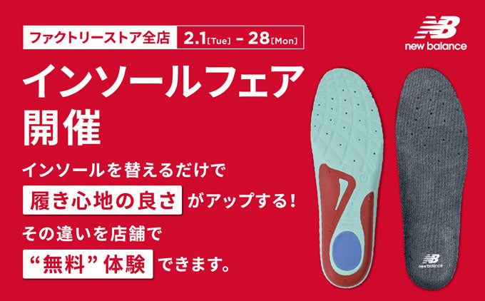 ニューバランス ファクトリーストア全店にて、2月1日(火)から2月28日(月)まで、「インソールフェア」を開催いたします。ニューバランスは1906年に矯正靴やアーチサポートインソールの製造メーカーとして誕生して以来、シューズの履き心地や機能性を追求してきました。インソールはシューズ着用時の安定性を向上したり、フィット感をより高めたりすることができます。今回のインソールフェアではお客様に合わせたインソールをご提案いたします。ご体験は無料です。ぜひその履き心地の良さをお試しください。
