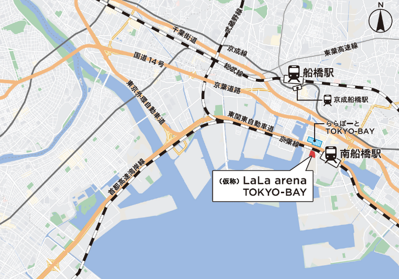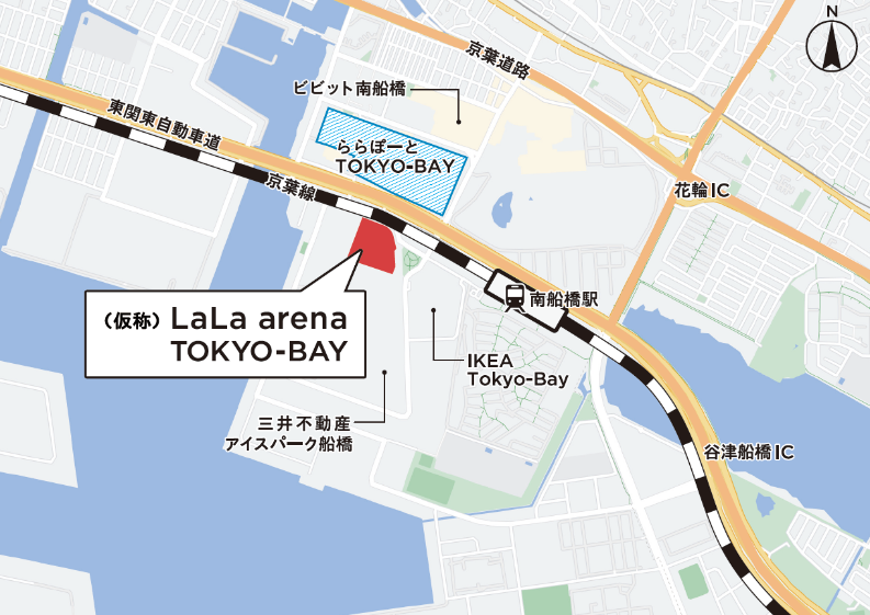 本アリーナは、JR京葉線「南船橋」駅に近く、交通利便性が高いだけでなく、三井不動産グループが管理・運営する「三井ショッピングパーク ららぽーとTOKYO-BAY」にも隣接しており、アリーナに来られるお客様がイベント前後にお買い物やお食事を一日中楽しんでいただくことができます。