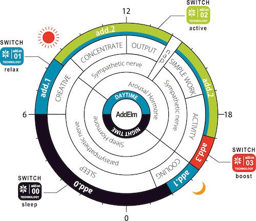 リブストイは、デンマーク語で「ライフウェア」という意味で、生活用途に合わせてカラダを整えるアドエルムのテクノロジーを採用。鉱石から抽出した様々な元素を調合したパウダーを繊維などの素材に加工し、人体生理学の治験データを基に、なりたいコンディションに合わせたウェアを展開。コンセプトショップで展開するのは、リラックスや休憩を目的としたコンフォートウェア4モデルと運動時のコンディションを整えるアクティブウェア1モデル。