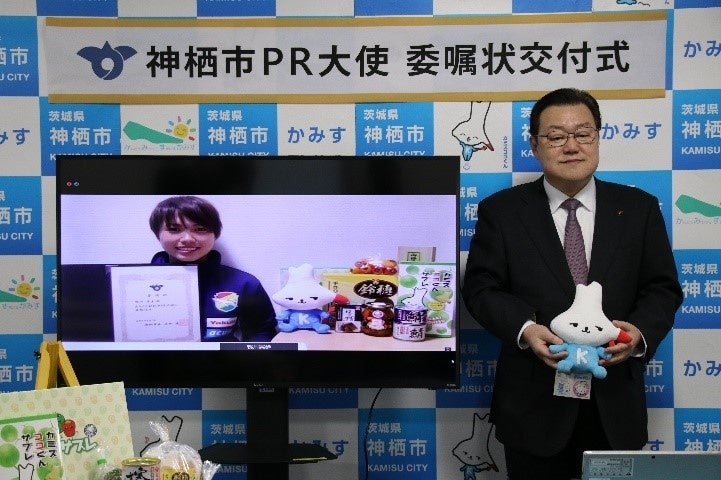 神栖市5組目のPR大使に就任した同市出身の鴨川選手は、2月7日に開催された委嘱状交付式にオンラインで(まん延防止措置期間のため)出席し、石田進神栖市長より委嘱状をいただきました。