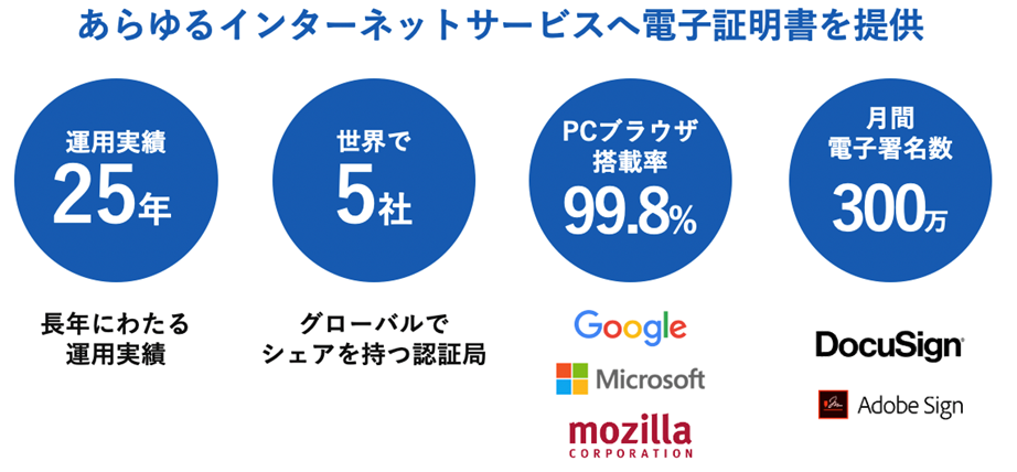 GMOグローバルサイン・HDとは、11万社の法人のサーバー運用実績、国内販売代理店 約6,700社の販売代理店を有するホスティング事業者であり、世界で5社しかないグローバルでシェアを持つ電子認証局の中で唯一の国産認証局「GlobalSign」を保有する老舗IT企業です。政府関連機関・大手企業をはじめ世界各国の企業・団体に電子証明書を導入しています。