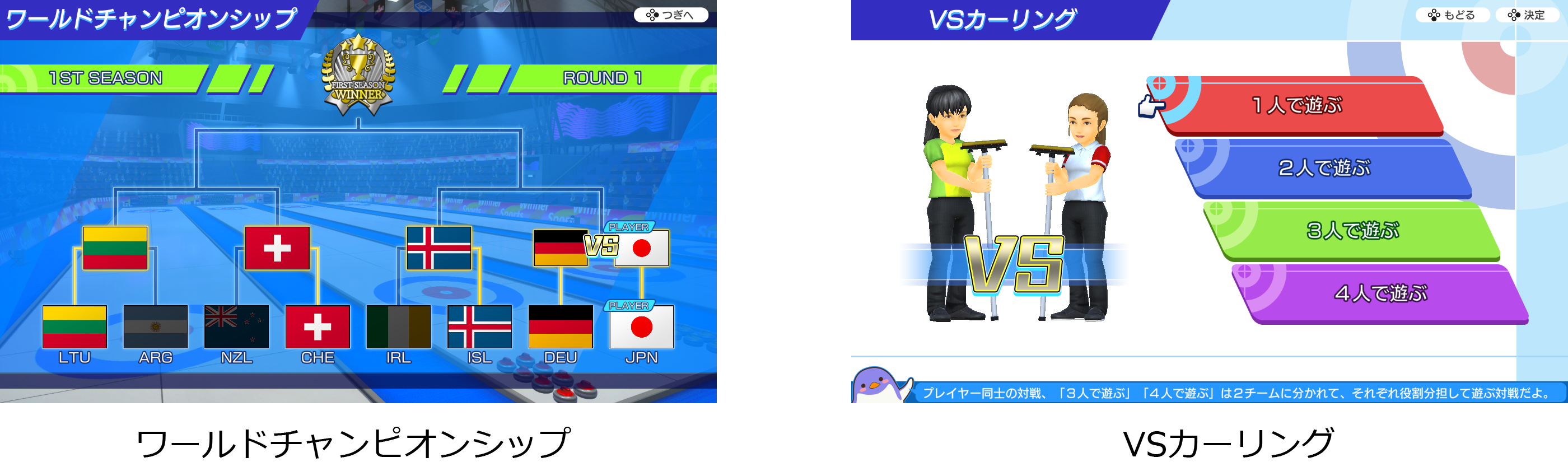 ワールドチャンピオンシップではプレイヤーが操作する国を選択し、トーナメントを勝ち進み世界の頂点を目指します。VSカーリングは対コンピュータだけでなく、2チームに分かれて最大4人までプレイヤー同士のオフライン対戦を楽しむことができます。