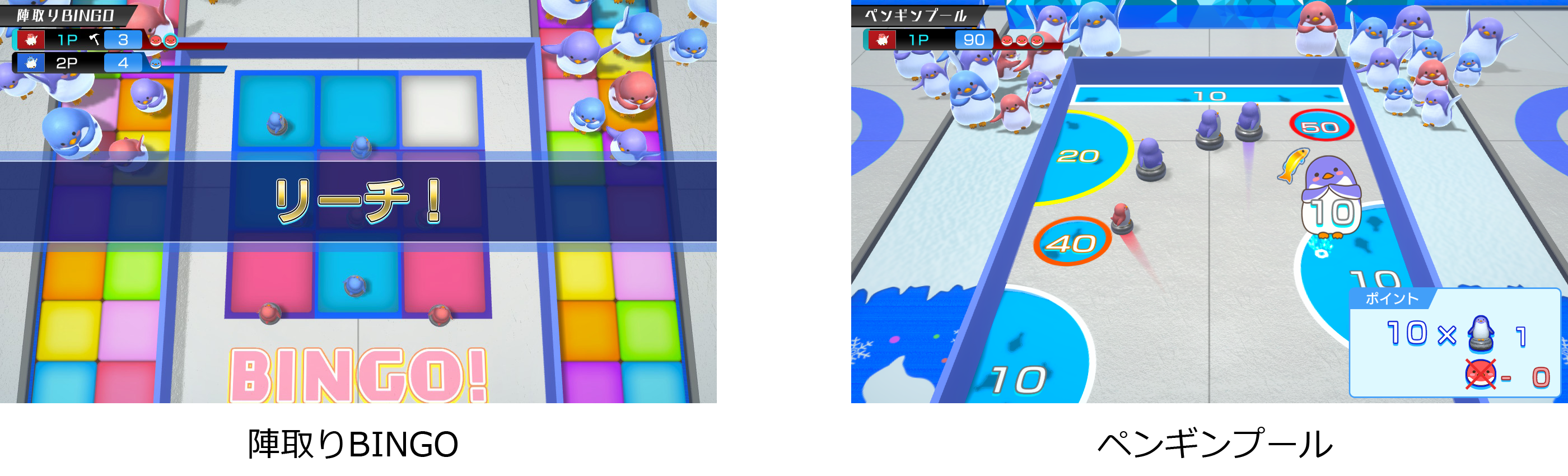 バラエティゲームではカーリングの要素を活かしてアレンジしたミニゲームとして、ストーンを放って3×3のマスを奪い合う「陣取りBINGO」や、可愛らしいペンギンが乗ったストーンを水の中に落として獲得した得点でハイスコアを競う「ペンギンプール」を収録。カーリングとルールは異なりますが、ショットに求められる強弱の感覚やストーンを弾き出す角度は共通。家族や友人と気軽にプレイしながら、カーリングの面白さを味わうことができます。