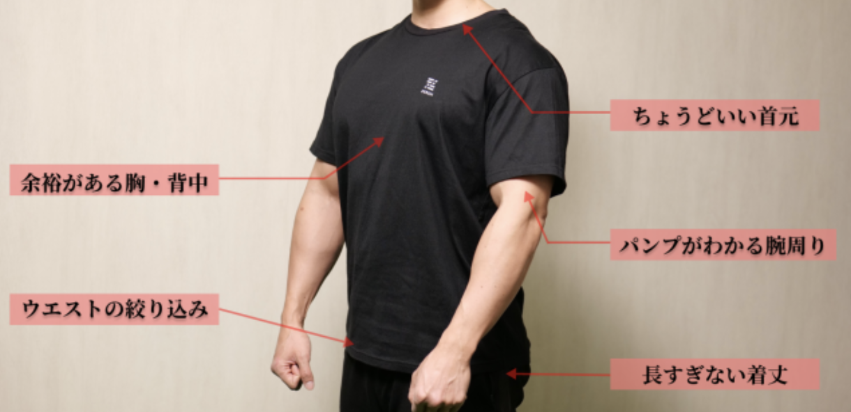 トレーニーが発達している部位である肩・首・腕・胸あたりを既製品に比べて大きめの採寸設計をしています。ウエストは身幅よりも小さい採寸にしているため鍛えた体が綺麗に見えるように逆三角形のシルエットを演出しています。ゆったり着れるだけでなく、トレーニーの身体が綺麗に見れるようファッション性も兼ね備えたTシャツです。