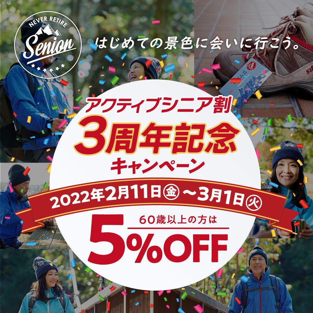 好日山荘のシニア向け優待「アクティブシニア割」は2019年3月のサービス開始以来、非常に多くの会員様にご好評いただき、おかげさまで3周年を迎えました。これを記念して、2022年2月11日(祝・金)~3月1日(火)の期間中、「アクティブシニア割 3周年記念キャンペーン」を開催します。通常、毎月1日・15日にアクティブシニア会員様は5%OFFでお買い物をお楽しみいただける内容ですが、混雑を避けご来店頂けるよう19日間開催し、安心してお買い物をお楽しみいただけます。既存会員様はもちろん、当日のメンバーズ入会および「アクティブシニア」登録いただいた方も対象となります。春に向けたウェアやギアアイテムをしっかりご準備いただき、登山、ハイキング、ウォーキングを安全に楽しみましょう。ぜひこのお得な機会をご利用下さい。