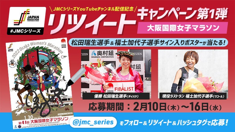 1月30日(日)に開催された「大阪国際女子マラソン」で、大会新記録で見事優勝した松田瑞生選手(ダイハツ)と現役ラストランを笑顔でフィニッシュした福士加代子選手(ワコール)のサイン入りポスターが当たるリツイートキャンペーンを実施します。