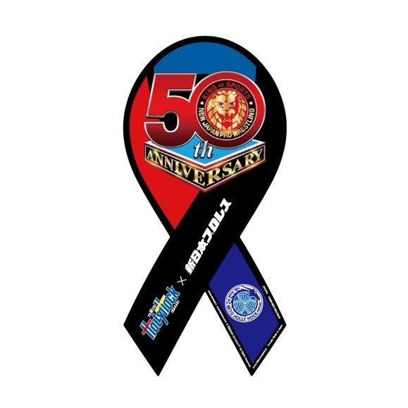 水戸ホーリーホックが新日本プロレス50周年をお祝いするコラボレーションリボンマグネット。プロレスグッズ史上初のアイテム。