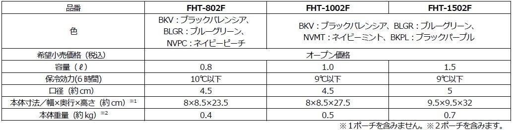『サーモス 真空断熱スポーツボトル(FHT-802F/1002F/1502F)』 仕様一覧