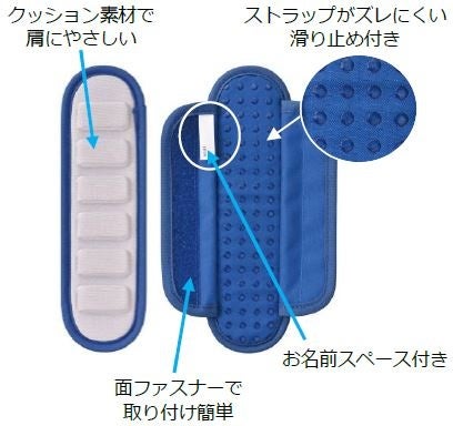 肩に かかる負担を軽減する クッション素材を採用。ショルダーストラップへの取り付けは面ファスナーで簡単に行え、滑り止め付きでズレにくくなっています。また、手洗いが可能で衛生的にご使用いただけます。