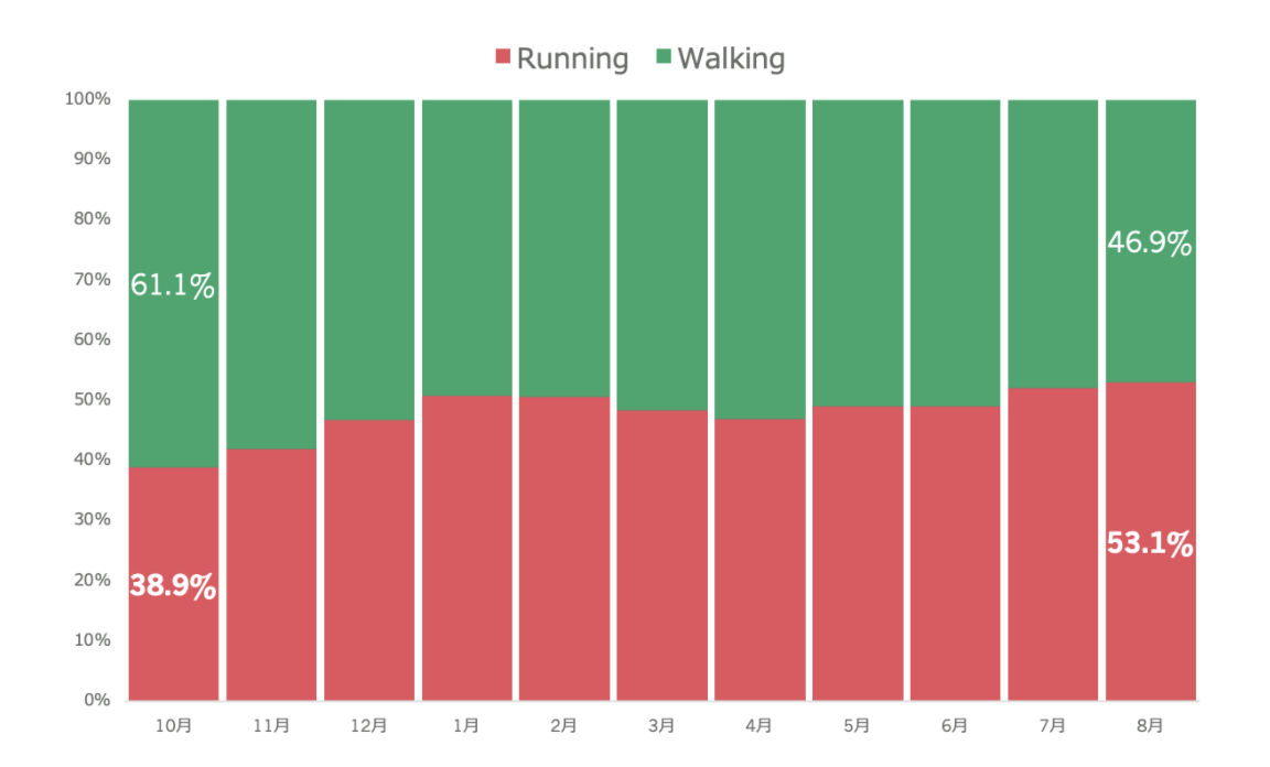 - 徐々にウォーキングからランニングの割合が増え、参加者の行動変容に寄与しております。