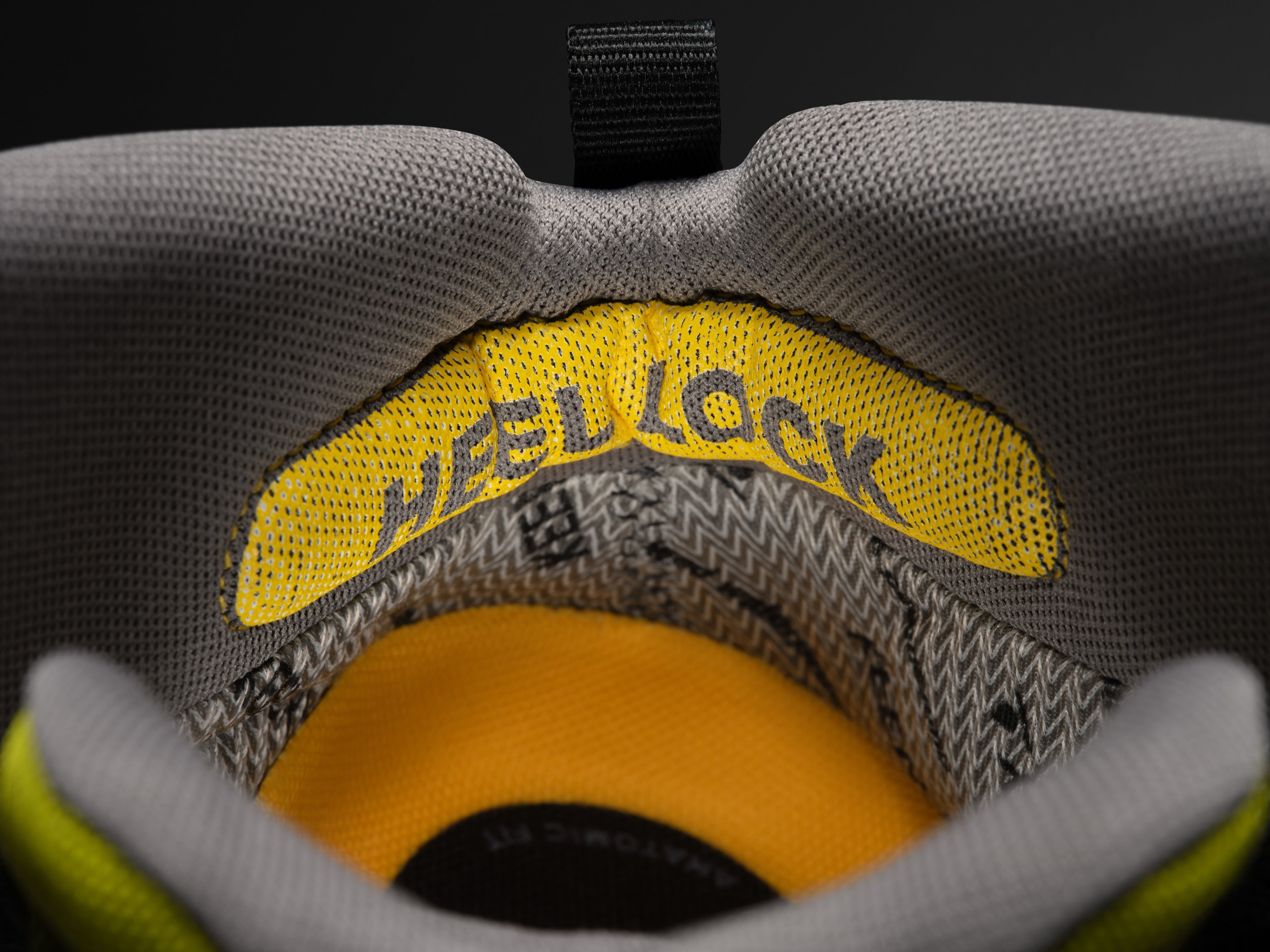 V字型のヒールキャプチャー システム「KONNECTFIT(コネクトフィット)」がかかとをホールドし、安定感を向上。スピードレーシングシステムのシューレースと連動し、まるで足と一体化したようなフィット感。