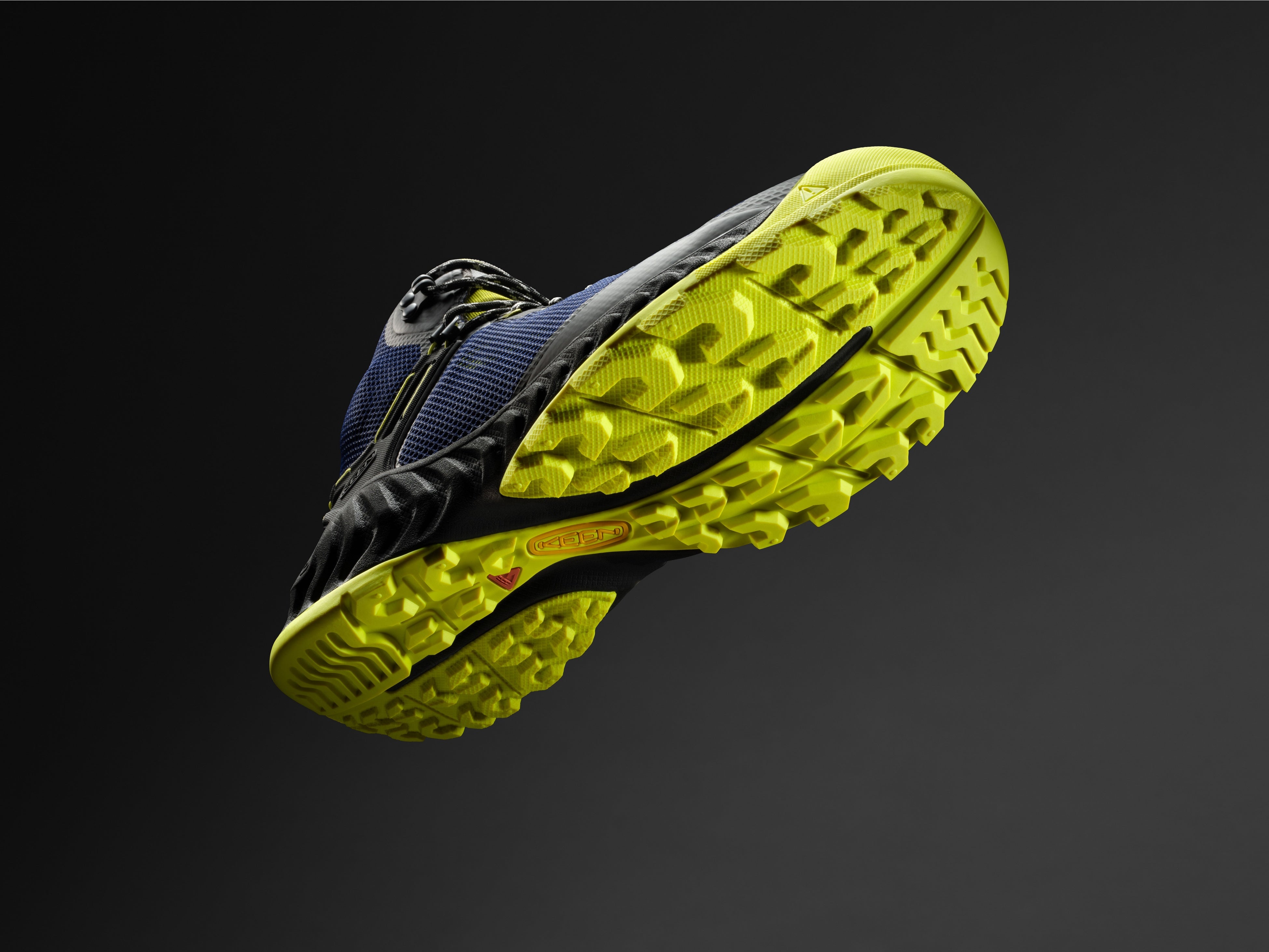 アウトソールには、全方向の動きに対応するオールテレインラバーソールを採用。4mmのブロックパターン、すり減りやすいつま先とかかと部分には接地面の多い横溝のラグパターンを採用し、難路でも高いグリップ力を発揮。