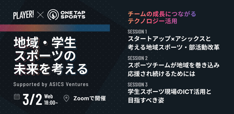 お気に入りの競技・チームを見つけて応援できるアプリPlayer!とスポーツ選手・チームのコンディション管理ソフトONE TAP SPORTS、スポーツ界に幅広いネットワークをもつアシックス・ベンチャーズが協力し、今回のカンファレンスを企画いたしました。