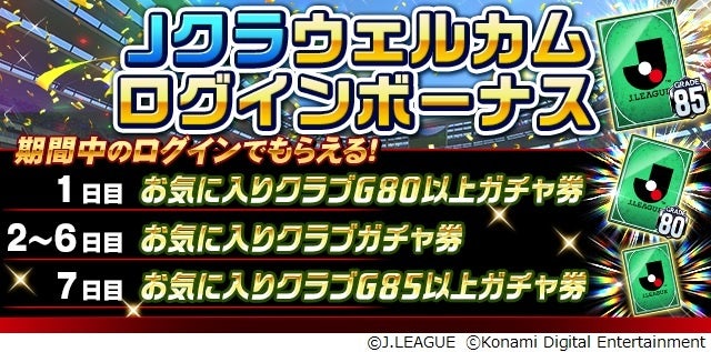 新たに『Jクラ』を始めた方を歓迎するログインボーナスで、毎回お気に入りクラブガチャ券を獲得できます。