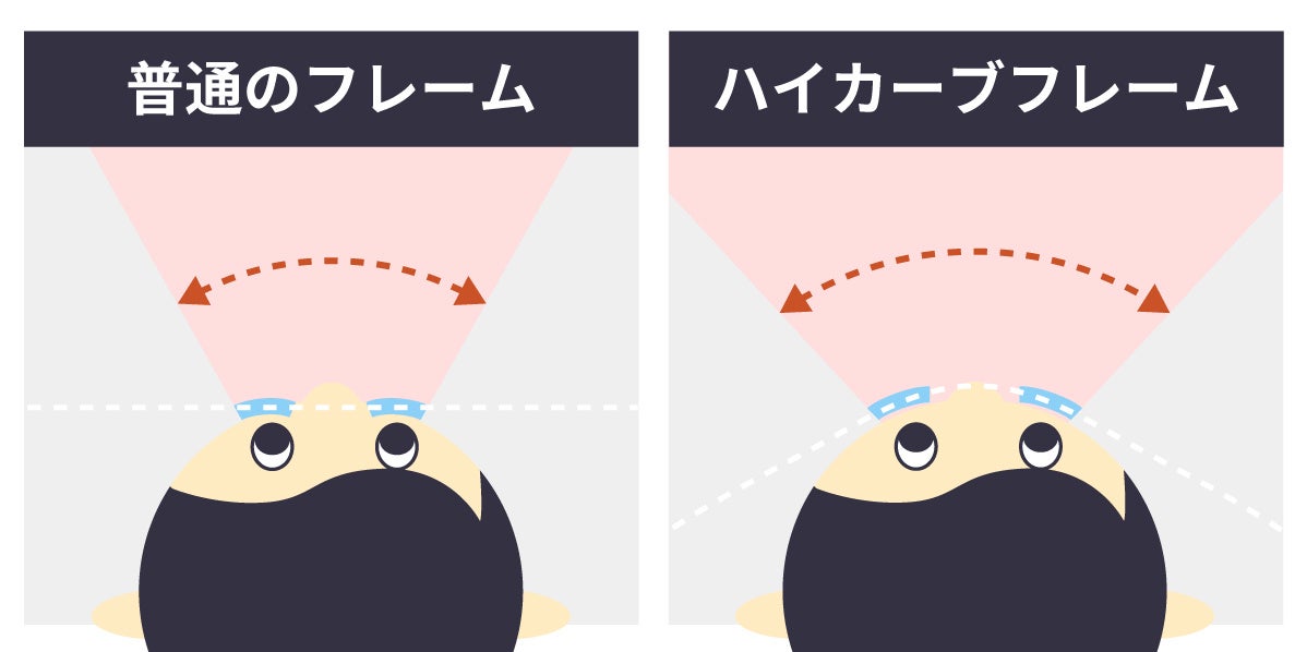 ハイカーブフレームは顔のカーブに沿って曲線が付けられているので、その分視野が広くなります。