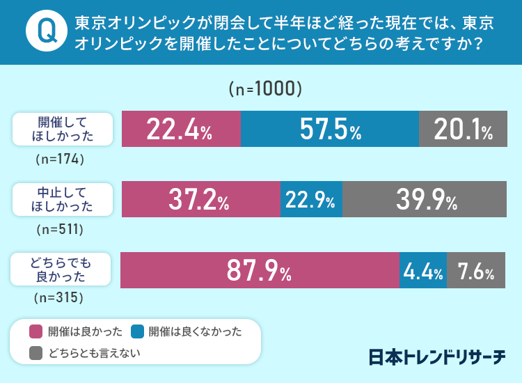 オリンピック開催前は、反対や延期を望む声も大きいように感じましたが、開催から半年ほど経った現在では、半数以上の方が「開催は良かったと思う」と感じているようです。