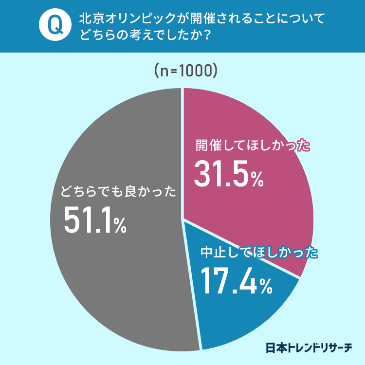 北京オリンピックの開催について、17.4%の方が「中止してほしかった」と回答し、「どちらでも良かった」と回答した方は半数を超えました。