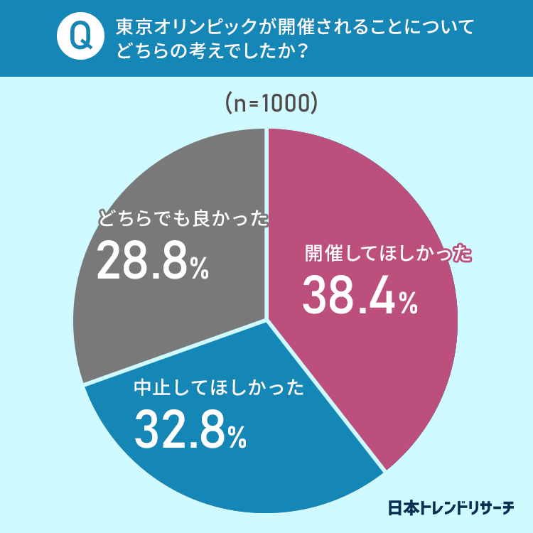 東京オリンピックが開催されることについての考えを聞いたところ、「開催してほしかった」と回答した方が38.4%、「中止してほしかった」「どちらでも良かった」と回答した方は、それぞれ3割程度でした。