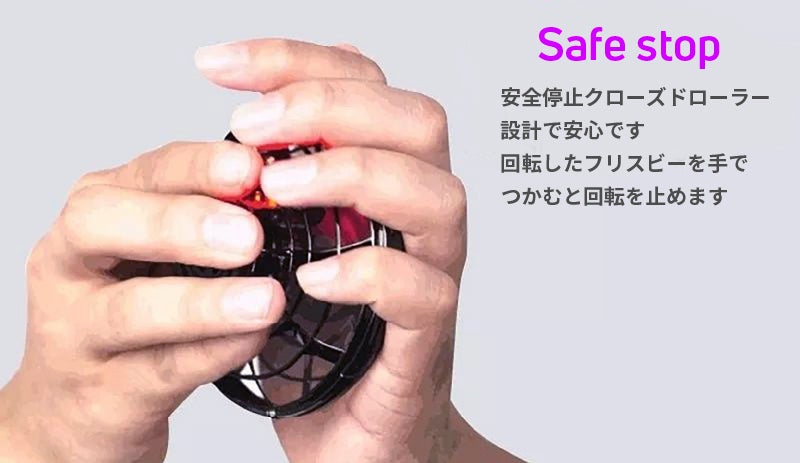 安全停止クローズドローラー設計で安心です。回転したフリスビーを手で掴むと、回転を止めます。