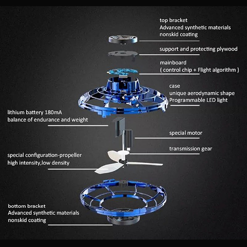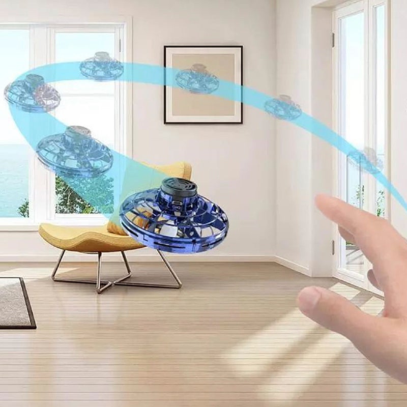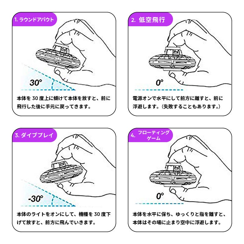 電源がオンになっているときに、GeeFrisbee(ジー フリスビー)を地面と水平にして前方に離すと、前に浮遊します。(低空飛行モードは失敗することがあります。)