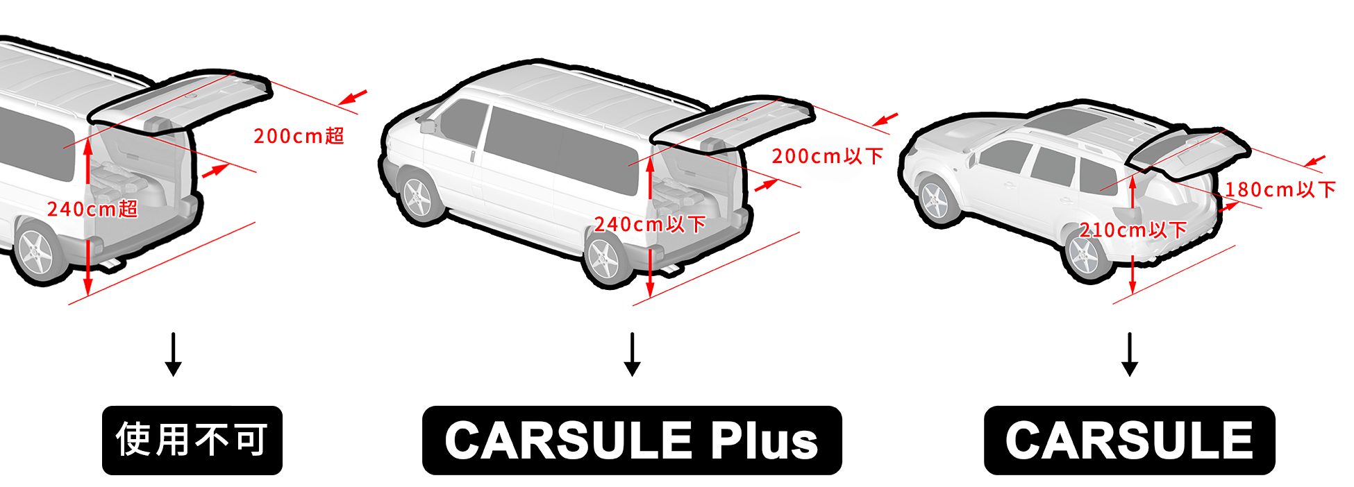 CARSULEはミニバン、SUV、ステーションワゴン等のバックドアがスイングアップする車に取り付けることができます。通常サイズのCARSULEに加え、高さが2.4mまで設置可能なCARSULE PLUSが新登場。幅広い車種に設置することができます。
