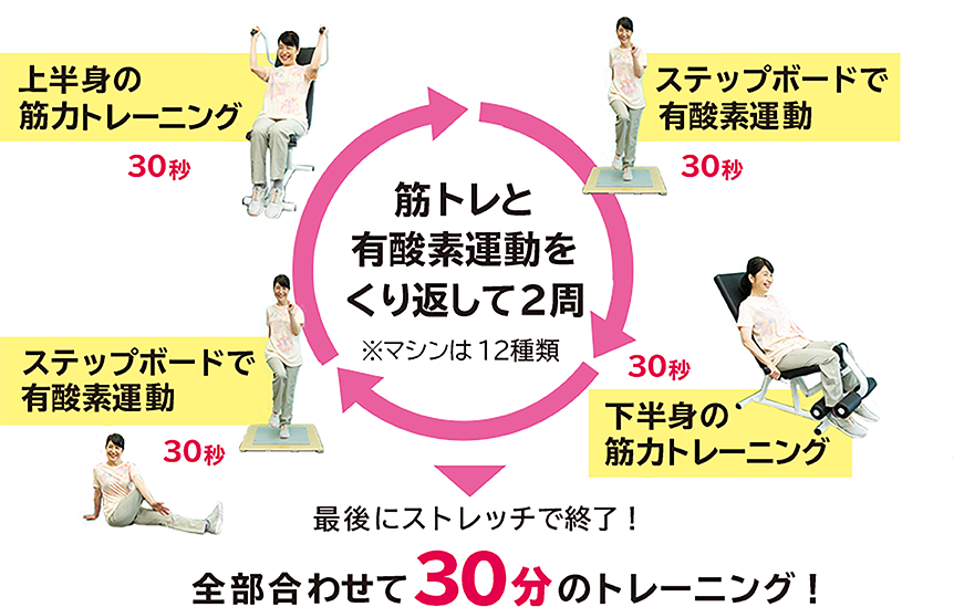 マシンを使って1回たった30分!効率よく全身の運動ができます。