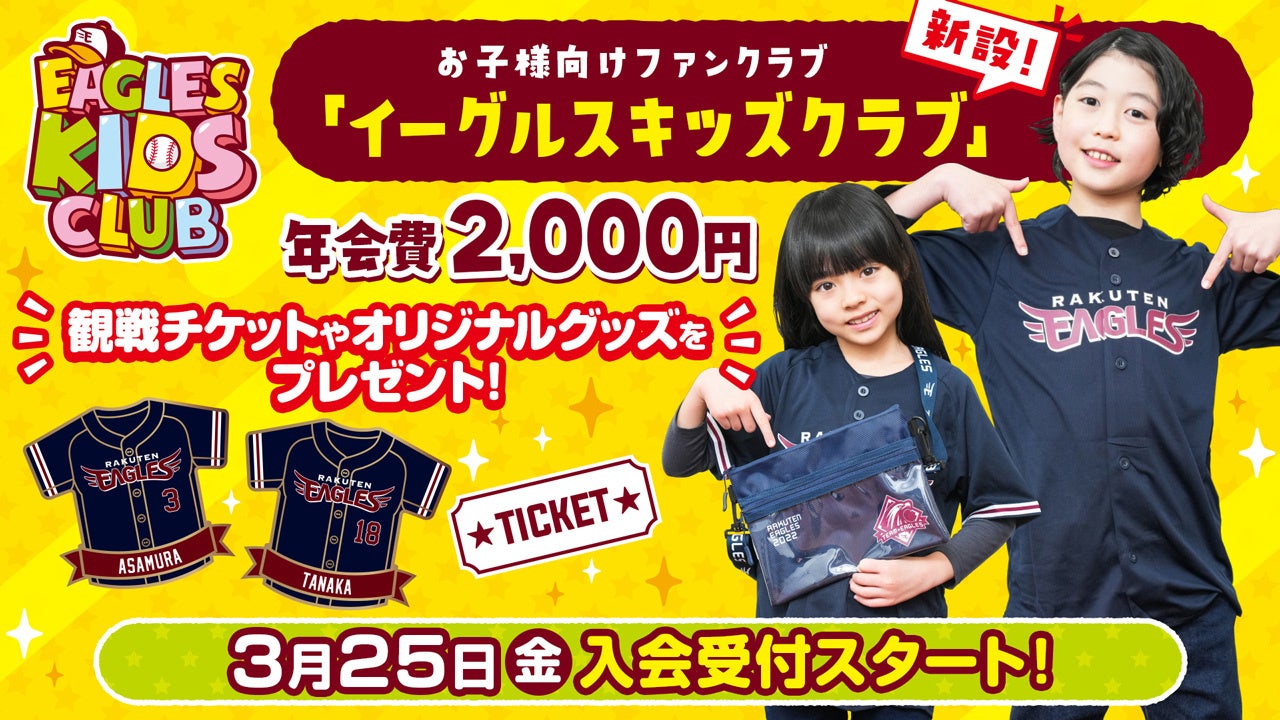 株式会社楽天野球団(本社:宮城県仙台市宮城野区、代表取締役社長:米田 陽介)は、開幕戦となる3月25日(金)より、お子様向けファンクラブとして新設した「イーグルスキッズクラブ」の入会受付を開始することとなりましたので、お知らせいたします。