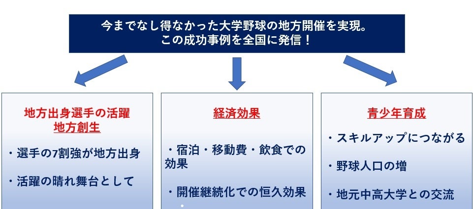迫力ある大学野球の真剣勝負を間近で観ることで、減少傾向にある野球人口の増加、大学野球のファンづくりによる認知アップを図ります。また、地方創生、開催地への経済効果の波及を狙います。