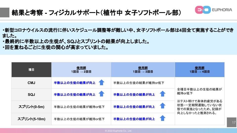スポーツテック企業の株式会社ユーフォリア(本社:東京都千代田区 共同代表:橋口 寛/宮田 誠、以下 ユーフォリア)は、さいたま市が進める「スポーツを科学する生徒の育成事業」(令和3年度)に参加し、2021年7月〜12月に市内2校の中学校部活動で実証実験・研究を行いました。コンディション管理ソフトONE TAP SPORTSの利用、およびアスレティックトレーナー、栄養士の介入により、フィジカルパフォーマンスの向上、食事スコアの向上が見られたことをお知らせいたします。