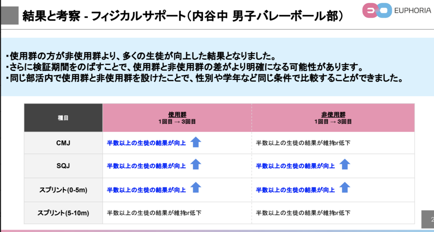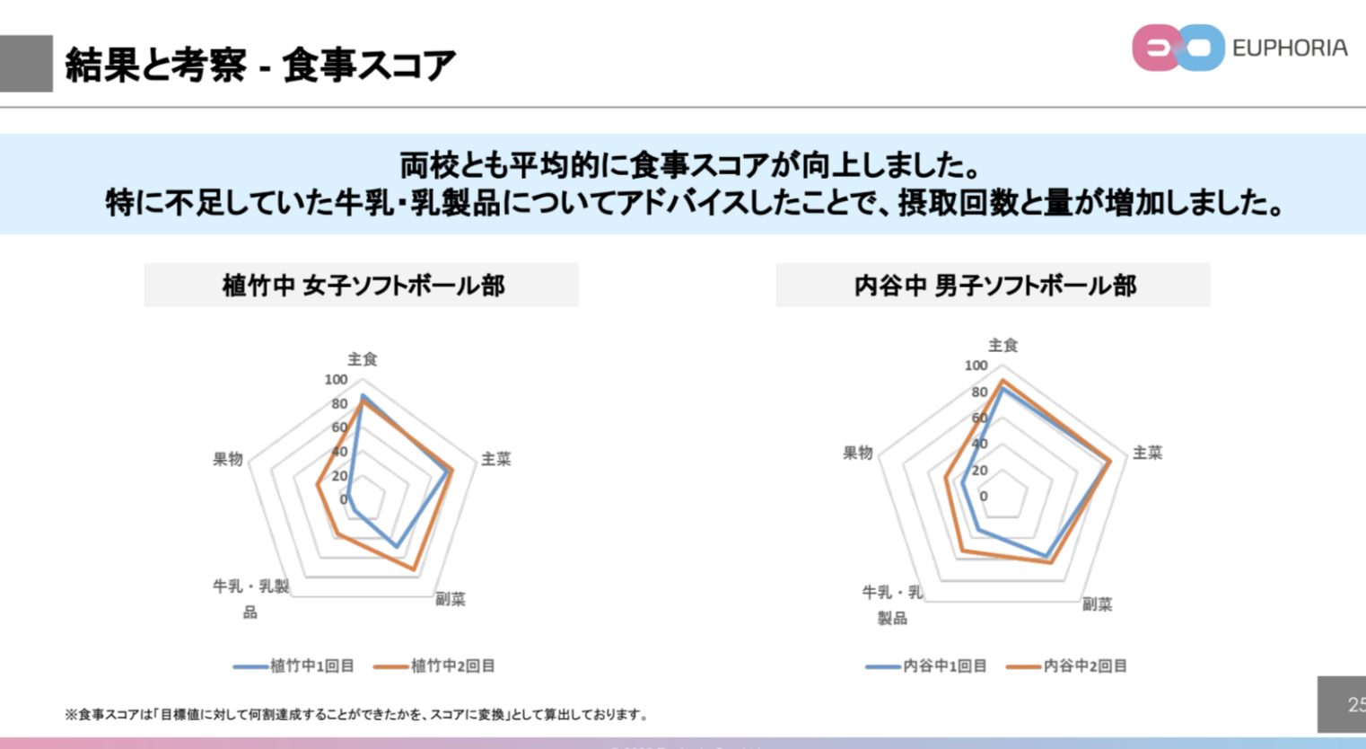 スポーツテック企業の株式会社ユーフォリア(本社:東京都千代田区 共同代表:橋口 寛/宮田 誠、以下 ユーフォリア)は、さいたま市が進める「スポーツを科学する生徒の育成事業」(令和3年度)に参加し、2021年7月〜12月に市内2校の中学校部活動で実証実験・研究を行いました。コンディション管理ソフトONE TAP SPORTSの利用、およびアスレティックトレーナー、栄養士の介入により、フィジカルパフォーマンスの向上、食事スコアの向上が見られたことをお知らせいたします。