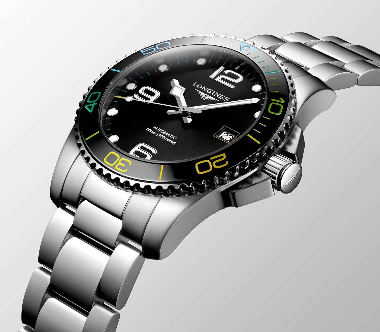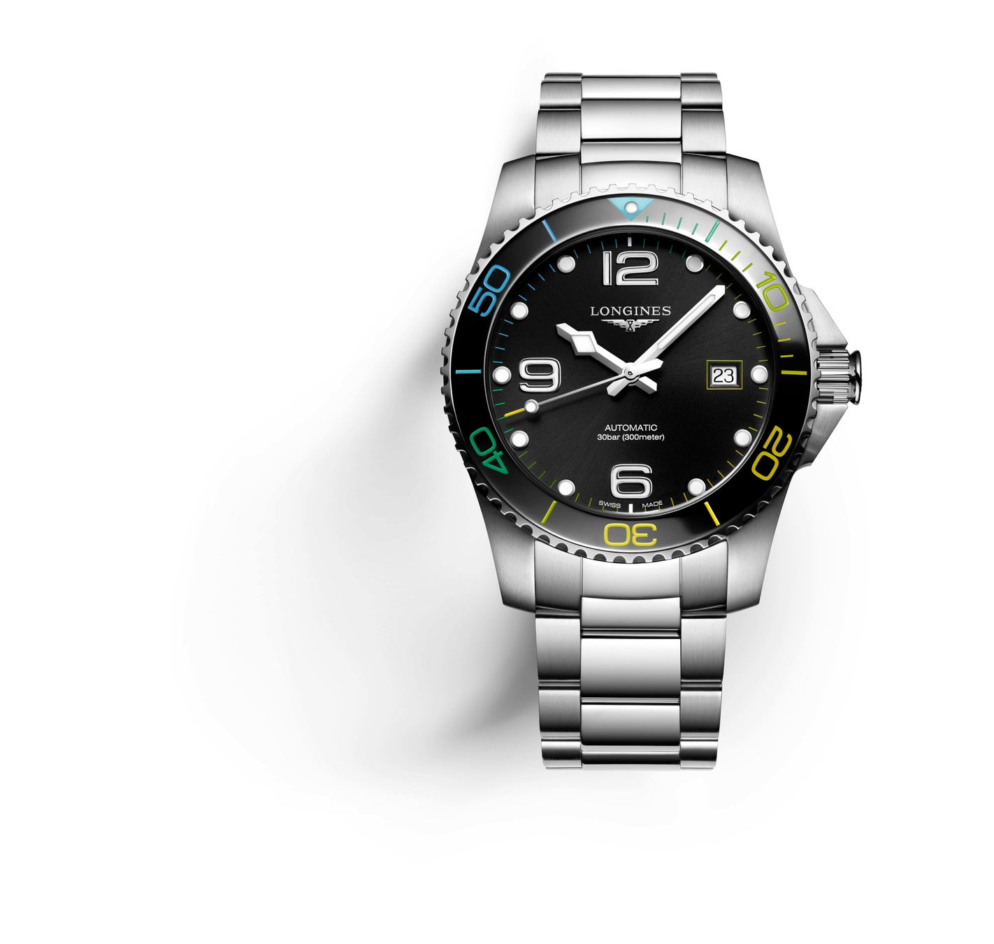 機能性も抜群。30気圧防水、逆回転防止ベゼル、ねじ込み式のリューズとケースバック、ダブルセーフティフォールディングクラスプ装備のブレスレットをはじめ、”ハイドロコンクエスト”が持つ高いスペックで満たされています。41 mmのスチール製ケースには、シリコン製ヒゲゼンマイを備えた高精度のロンジンエクスクルーシブ自動巻きムーブメントを搭載。永く愛用できる5年間の保証付きです。