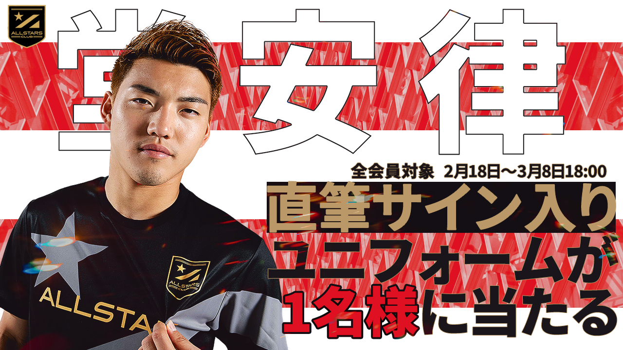 ALLSTARS CLUB会員様の中から抽選で1名様に堂安選手の直筆サイン入りALLSTARSユニフォームをプレゼント。
