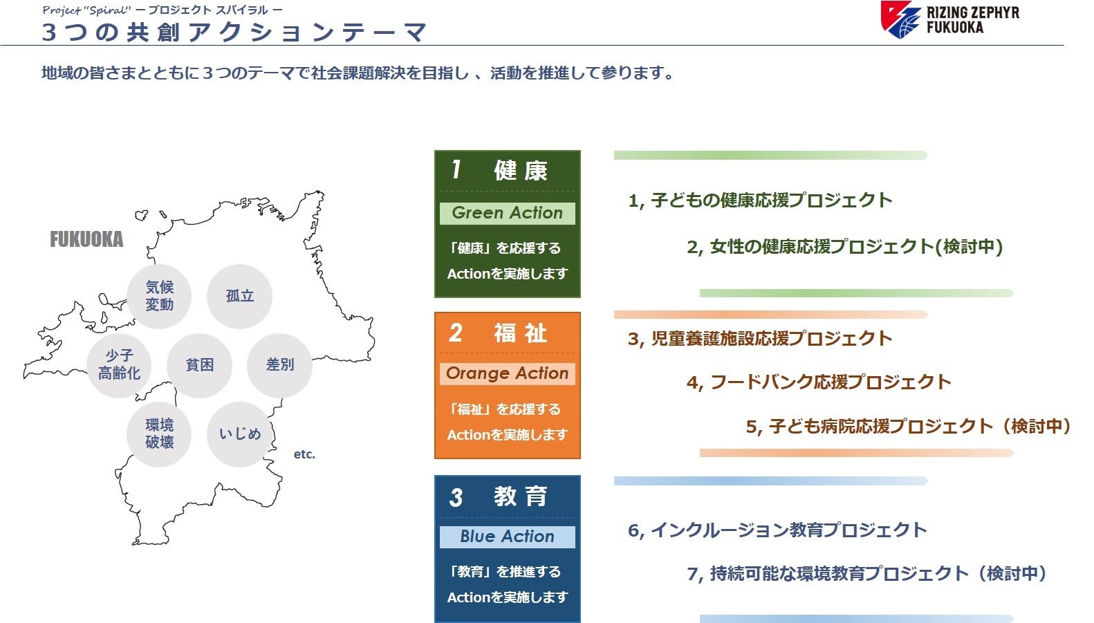 ライジングゼファーフクオカでは、これまでも福岡県や福岡市をはじめとする行政の皆さまとの共同での取り組みや、パートナー企業の皆さまとの取り組みを実施して参りましたが、新たに「健康」「福祉」「教育」の3つのテーマのもとで、共創企画として地域貢献活動のプロジェクトを推進して参ります。
