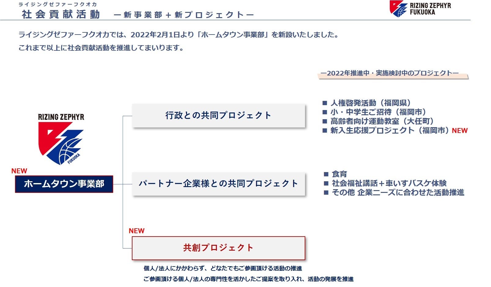 ライジングゼファーフクオカでは、これまでも福岡県や福岡市をはじめとする行政の皆さまとの共同での取り組みや、パートナー企業の皆さまとの取り組みを実施して参りましたが、新たに「健康」「福祉」「教育」の3つのテーマのもとで、共創企画として地域貢献活動のプロジェクトを推進して参ります。