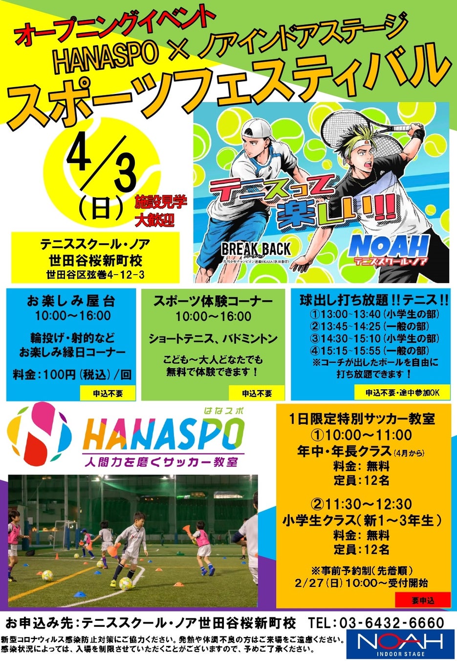 スポーツフェスティバルではテニス・ショートテニス・バドミントン・サッカーが体験でき、輪投げ・射的などお楽しみ縁日コーナーもあり、1日中ご家族で楽しめるイベントで、ラケット・シューズは無料レンタルでき、「手ぶらで体験」ができます。4月にオープンするテニススクール・ノア世田谷桜新町校は足腰に優しいカーペットコートでこども達が安心しておもいっきりスポーツを楽しめる施設です。HANASPOサッカー教室ではTOPアスリートの経験と、花まる学習会の幼児教育の現場知見を融合した人間力を磨くための全く新しい教育プログラムを体験できます。