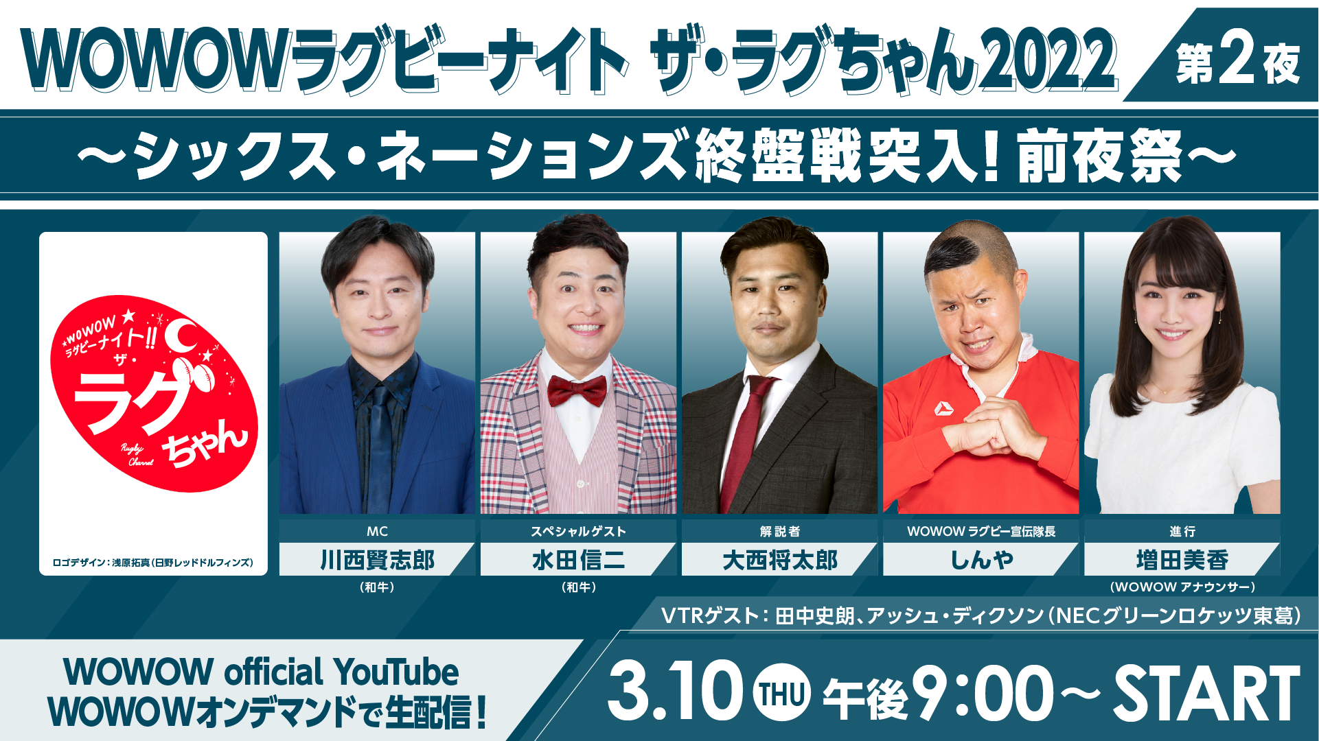 MCは、自身も学生時代にラグビー経験のある“ラグちゃん”ではおなじみの川西賢志郎(和牛)。帝京大学ラグビー部出身のラグビー芸人・しんや(WOWOWラグビー宣伝隊長)、元日本代表の大西将太郎(解説)も引き続き出演する。そして今回のスペシャルゲストとして水田信二(和牛)が登場することが決定!さらに、現イングランドヘッドコーチのエディー・ジョーンズ、11・15・19年W杯日本代表の田中史朗(NECグリーンロケッツ東葛)と、昨季ハイランダーズで姫野和樹のチームメイトでもあったアッシュ・ディクソン(NECグリーンロケッツ東葛)もVTR出演する。